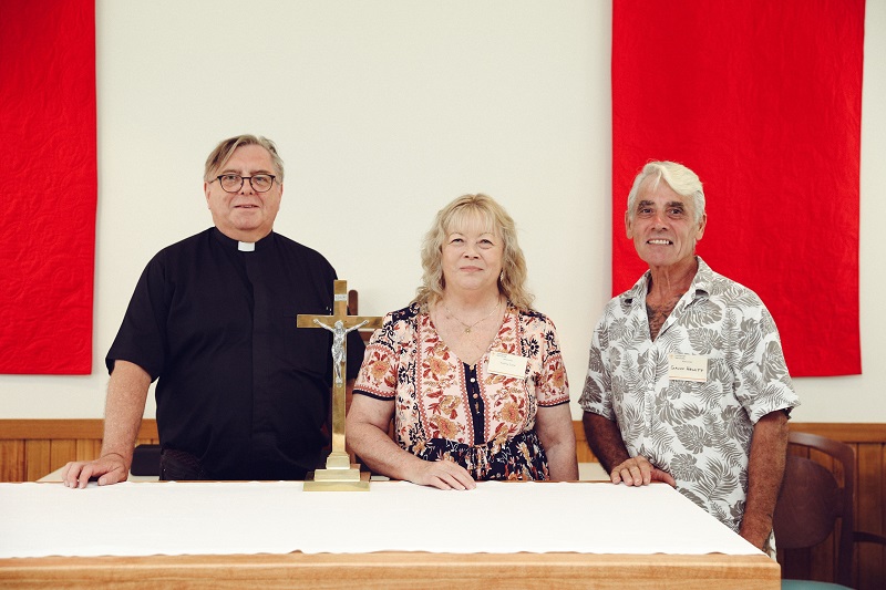 - Rev Dr Russell Briese, Kathy Lisle and Gavin Hewitt with the handcrafted altar.